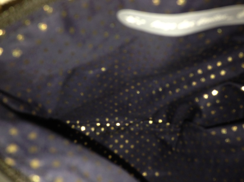 Trousse façon peau d’autruche camel intérieur tissu à pois bronze : 12€