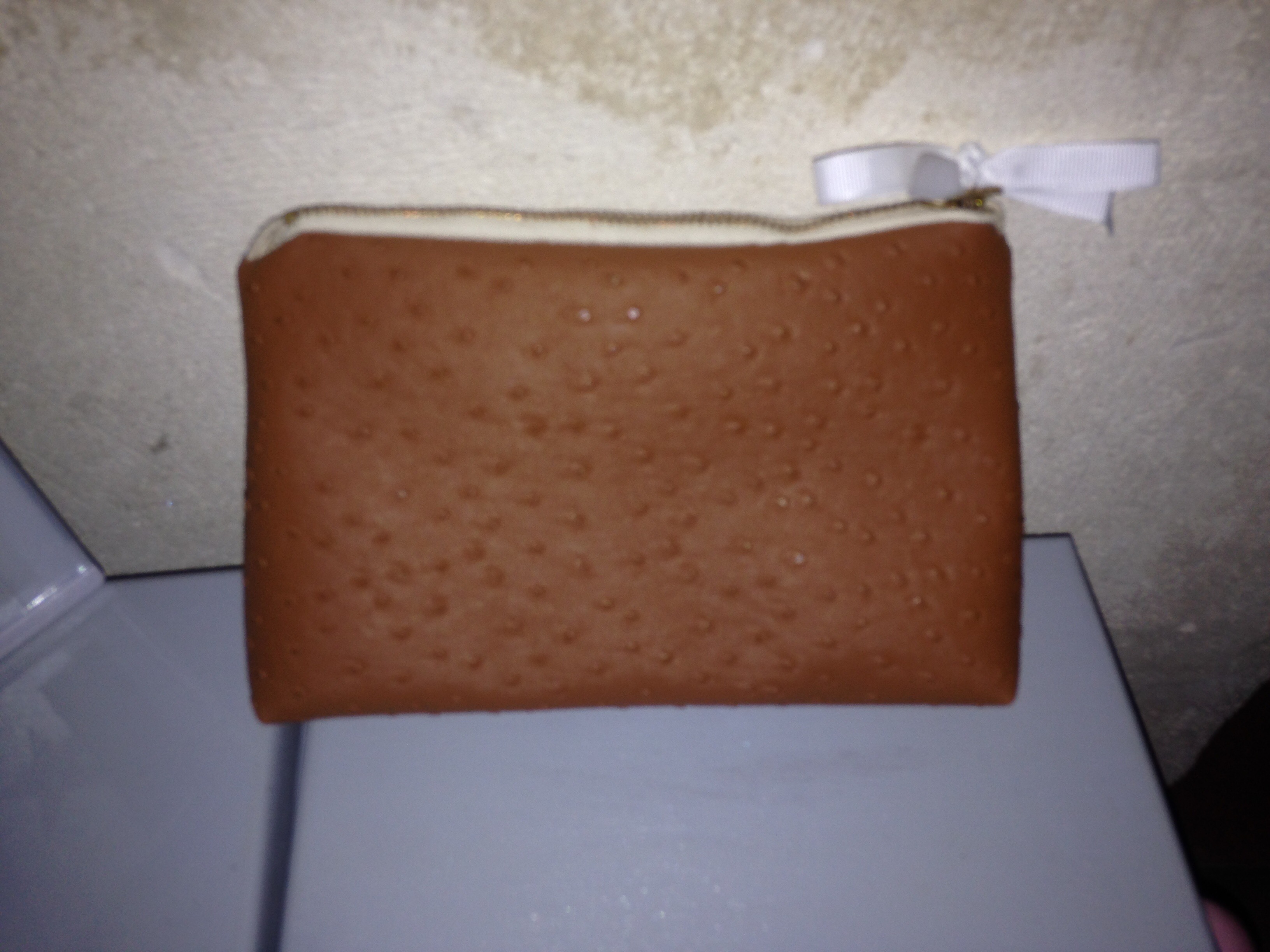 Trousse façon peau d’autruche camel intérieur tissu à pois bronze : 12€