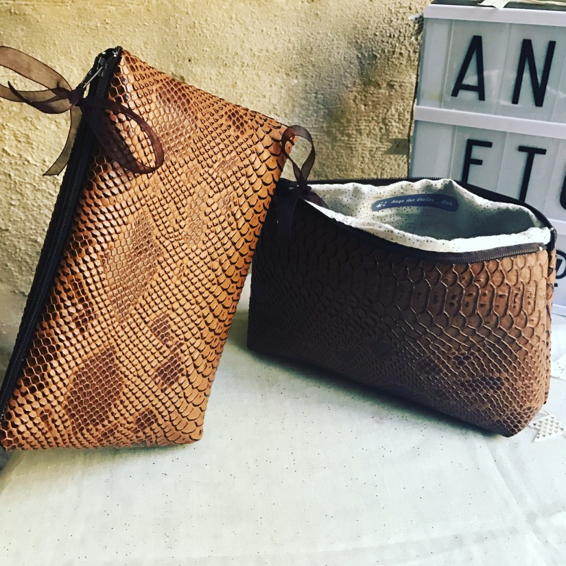 Trousses facon croco marron et intérieur coton blanc à pois dorés #ange_des_etoiles : 12€ l’unité
