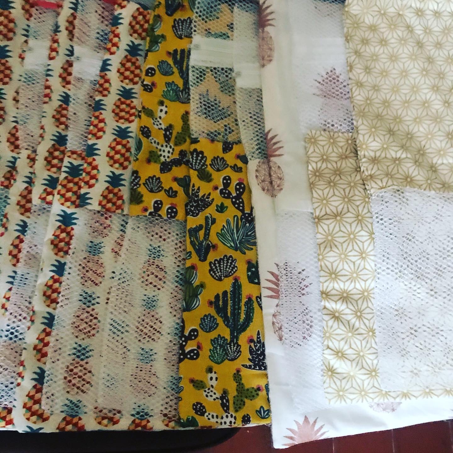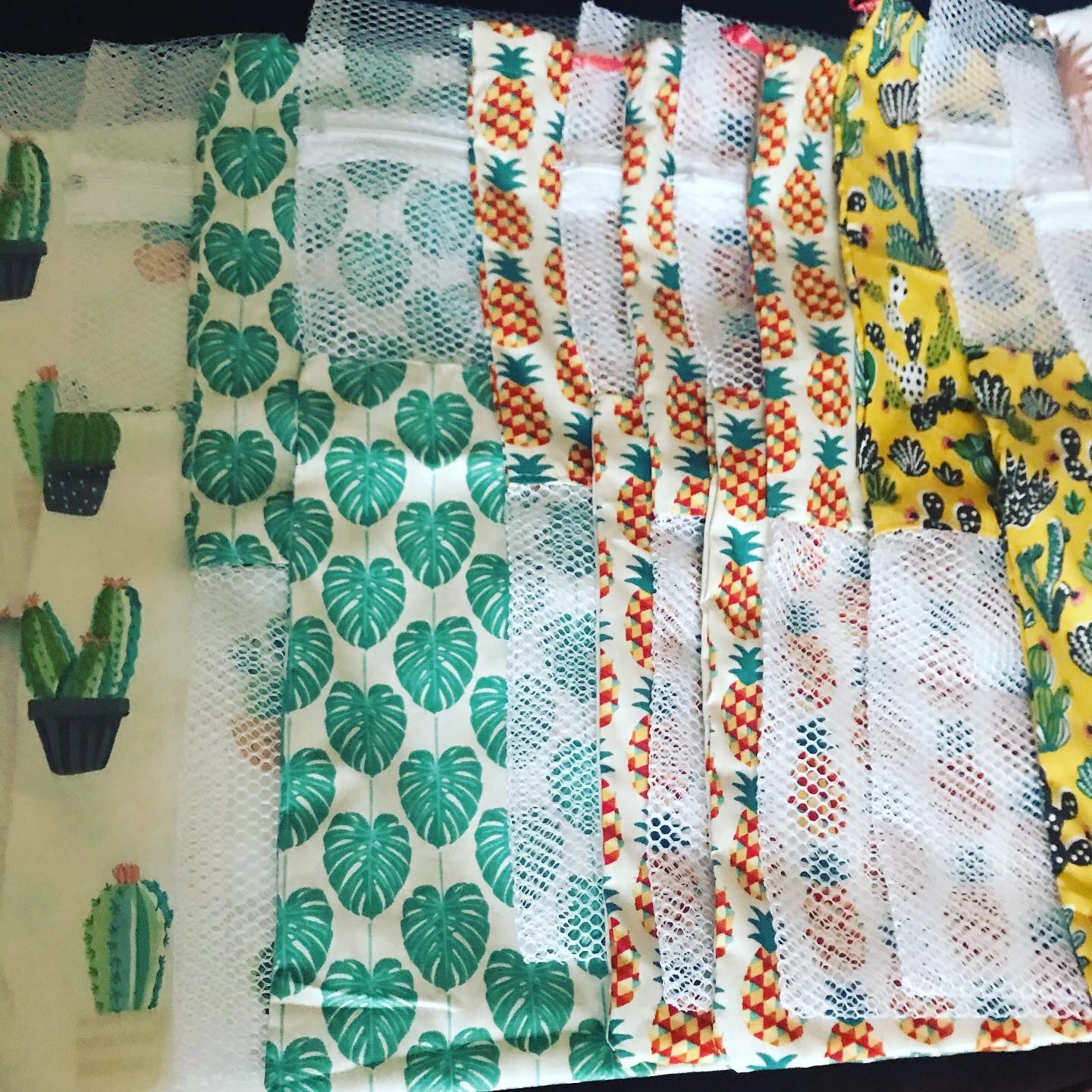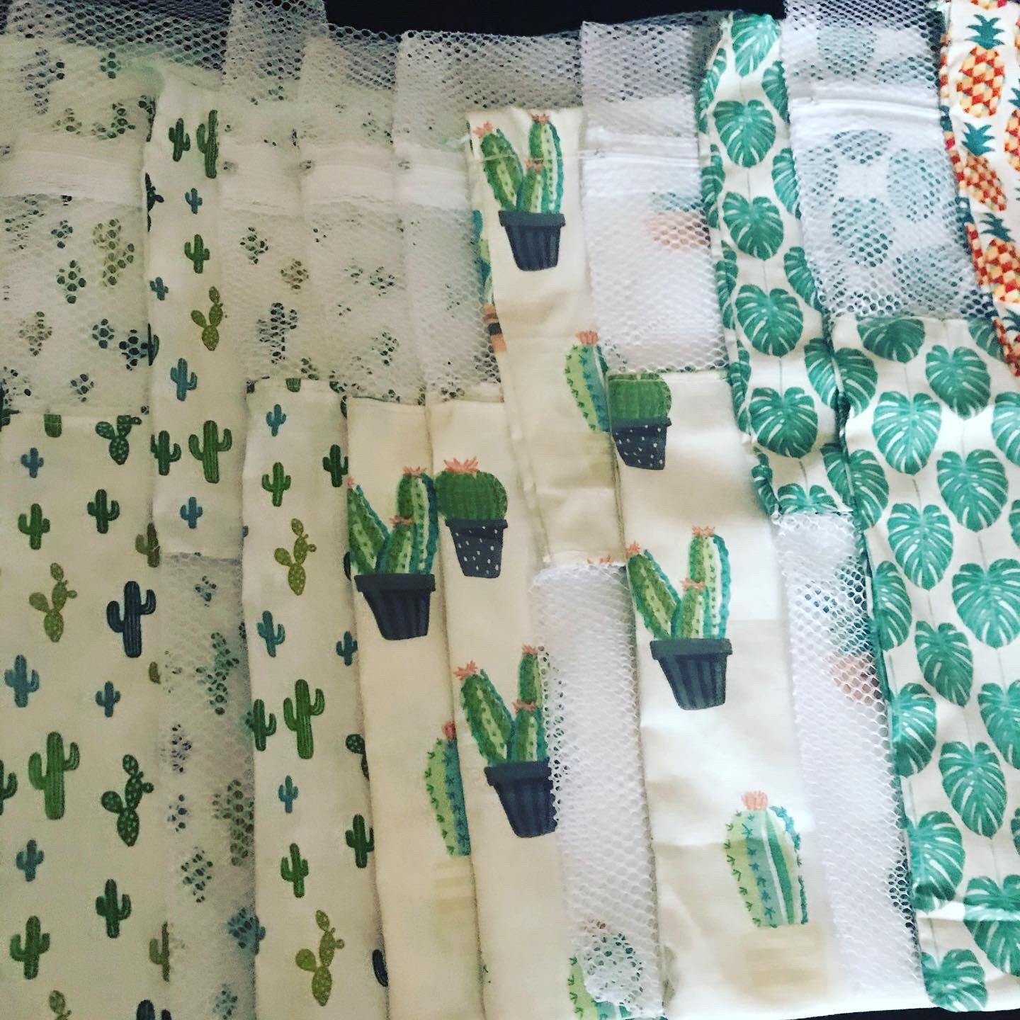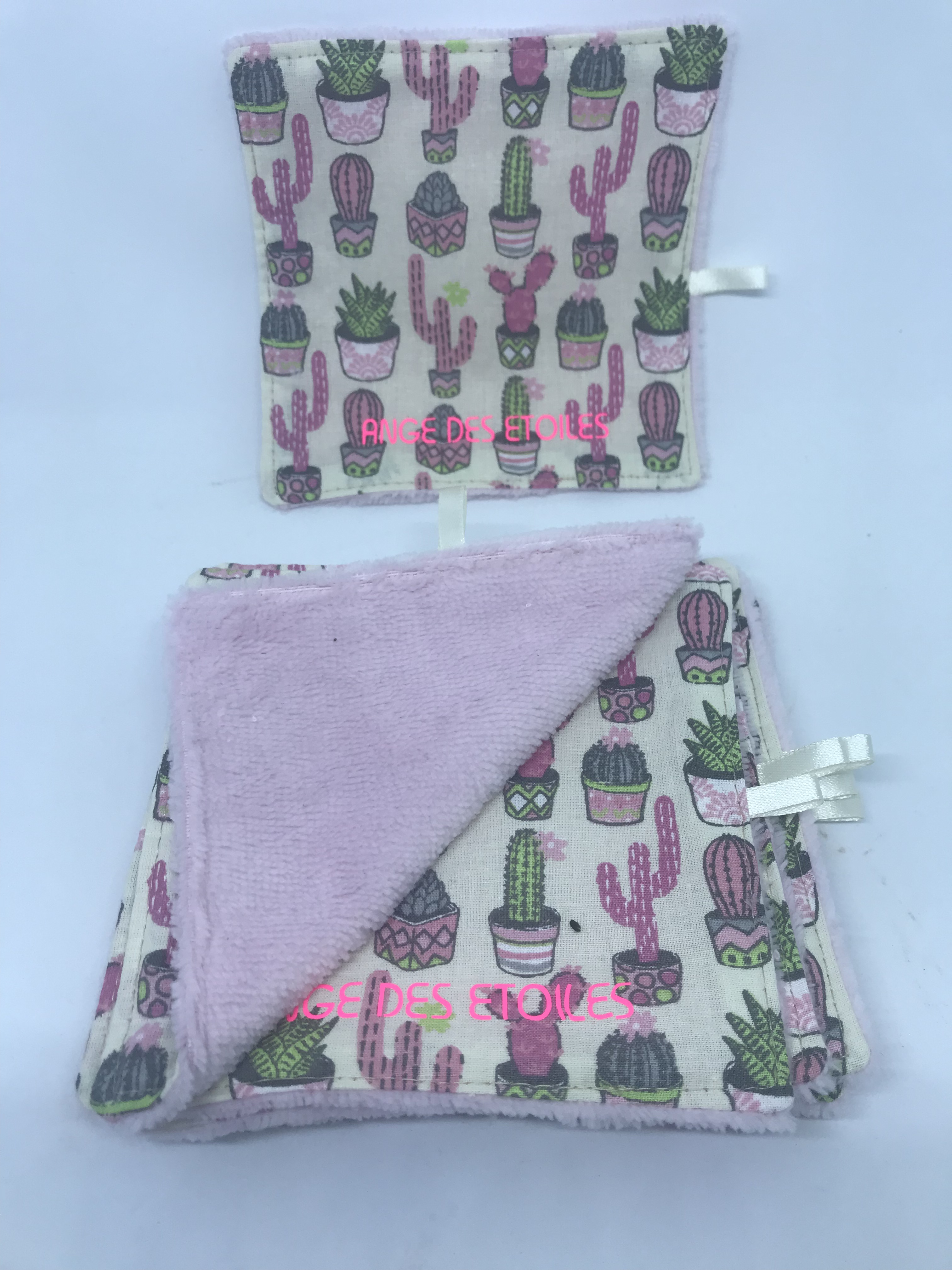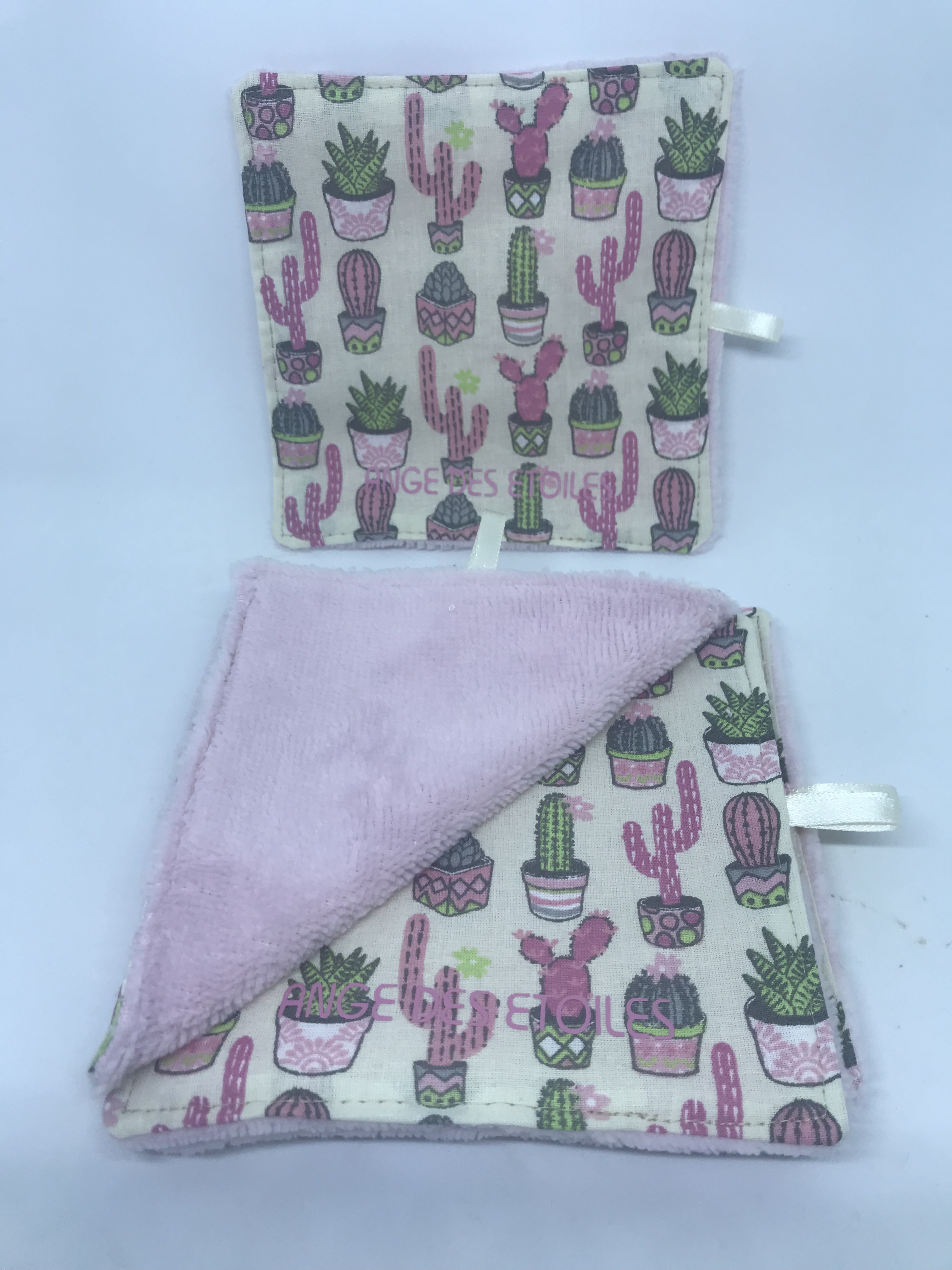 7 carrés éponges bio rose, tissu coton motif cactus.