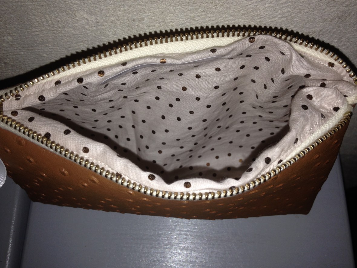 Trousse façon peau d’autruche camel intérieur tissu à pois bronze : 12€