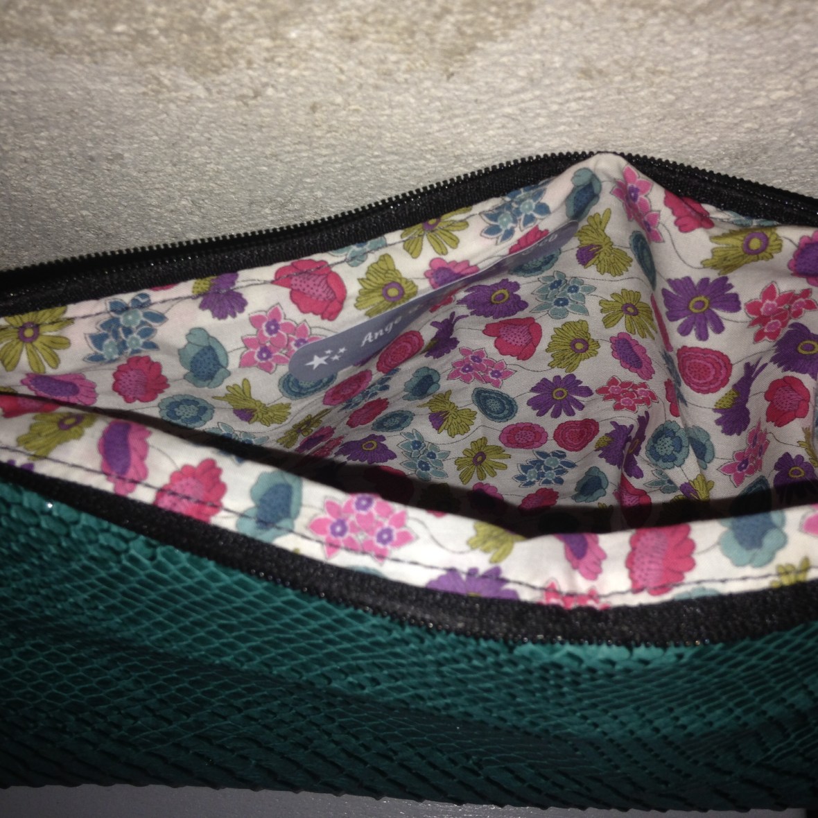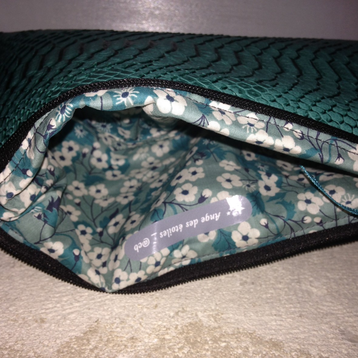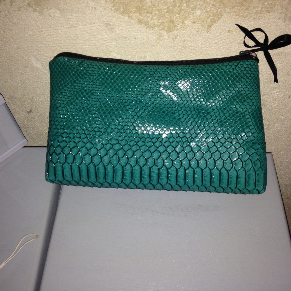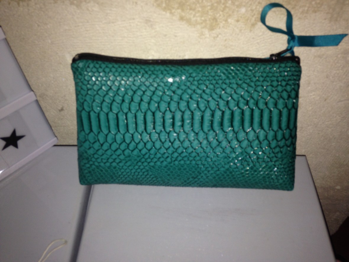 Trousse en simili cuir façon croco vert intérieur tissu Liberty : 12€
