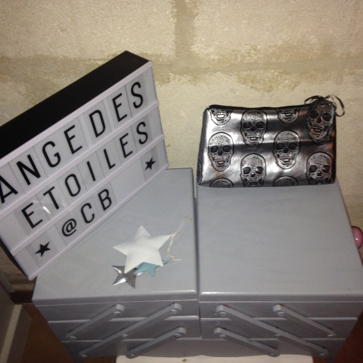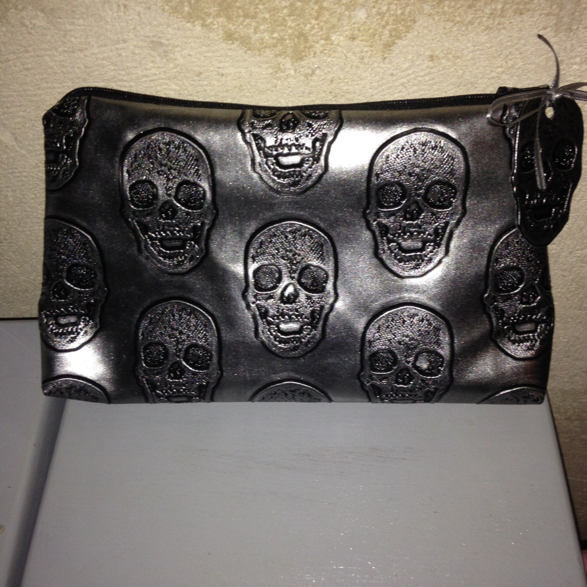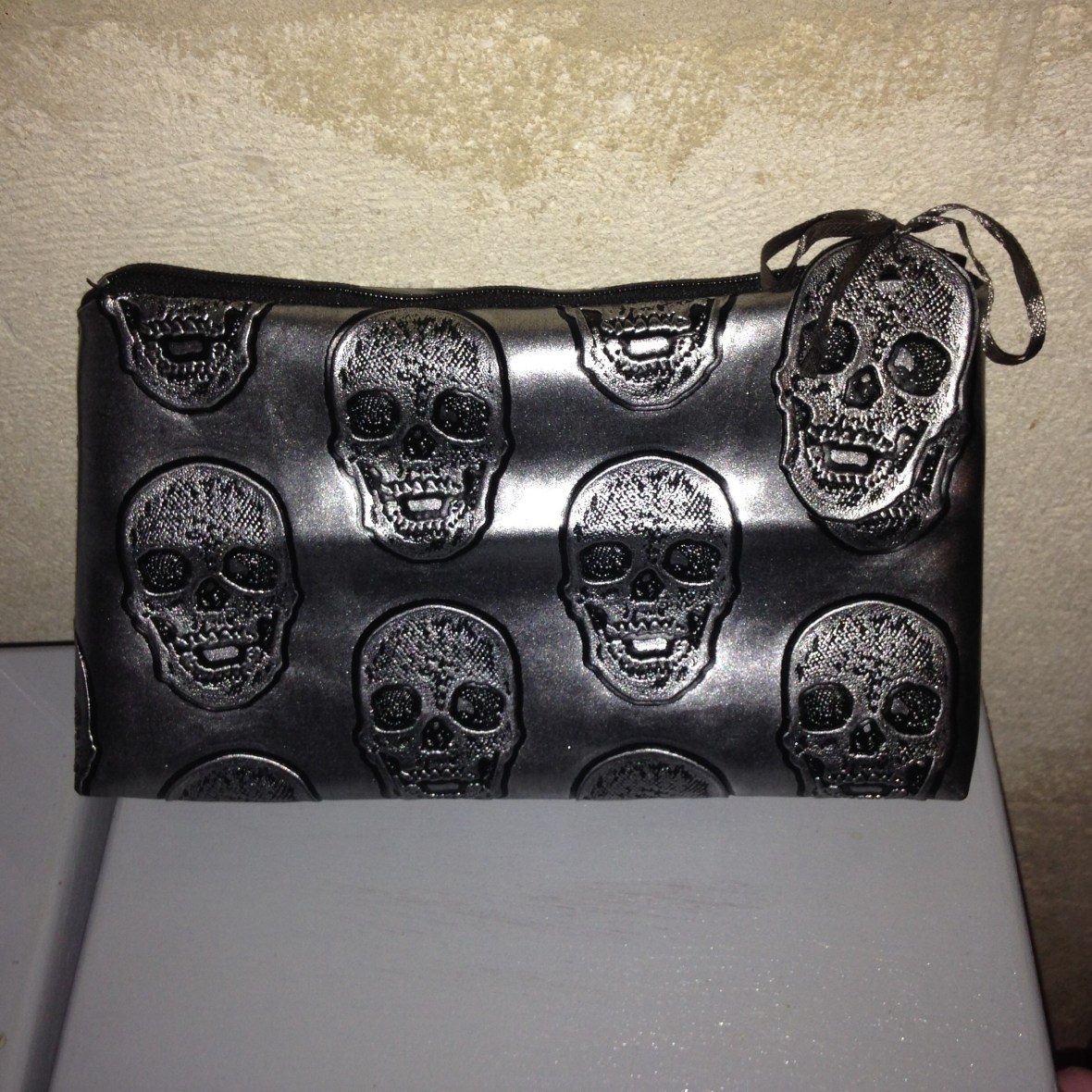 Trousse tête de mort grise intérieur tissu gris avec étoiles noires : 12€