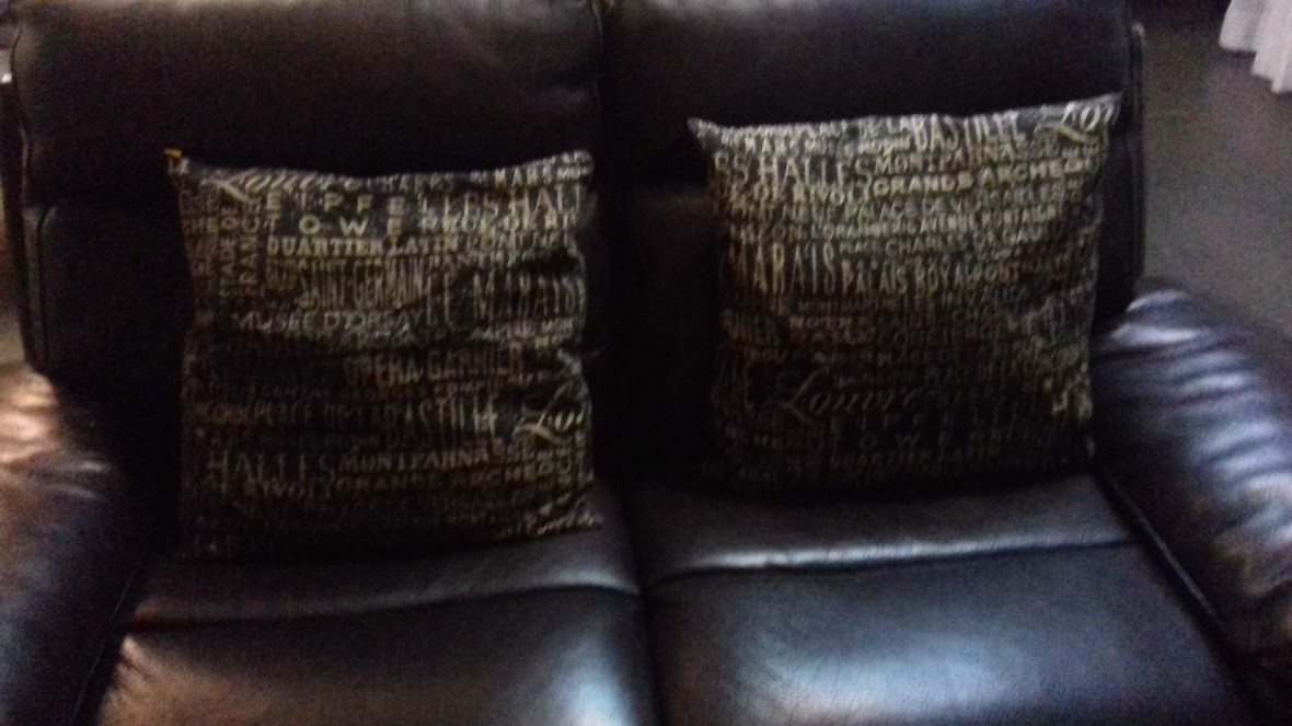 Mes créations chez mes clients : les coussins tissu noir et doré. Ange des étoiles ✨
