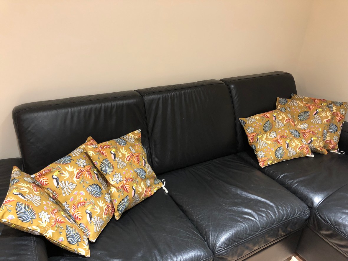 Photo de mes créations chez une cliente, Housse de coussin tissu Sophie ferjani en collaboration avec mondial tissu. Créations ✨ange des étoiles ✨