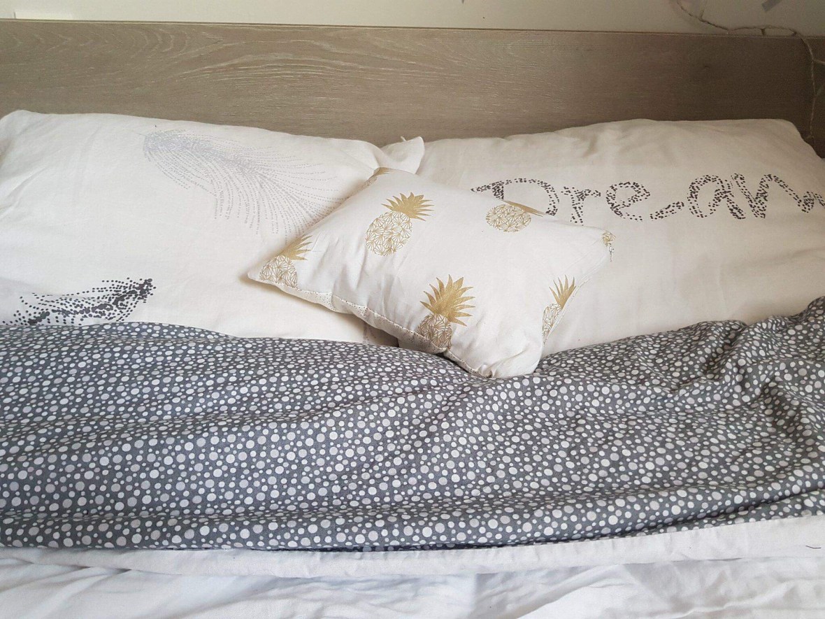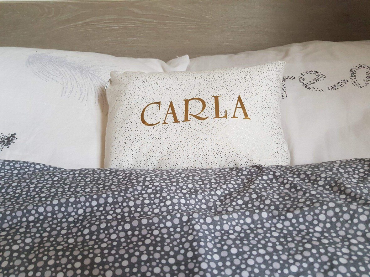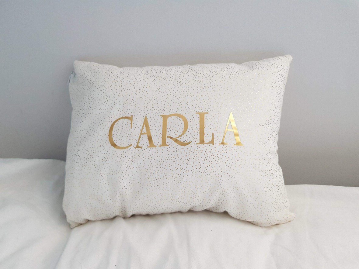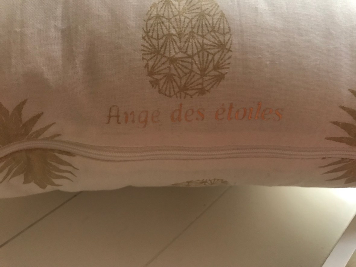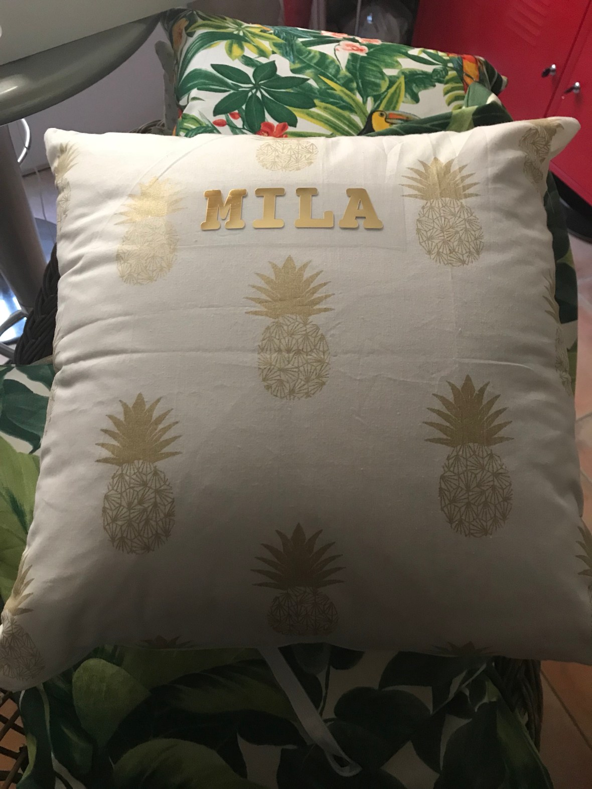 Coussin personnalisé pour une magnifique Mila. Coton blanc et ananas dorés. Création Ange des étoiles